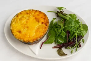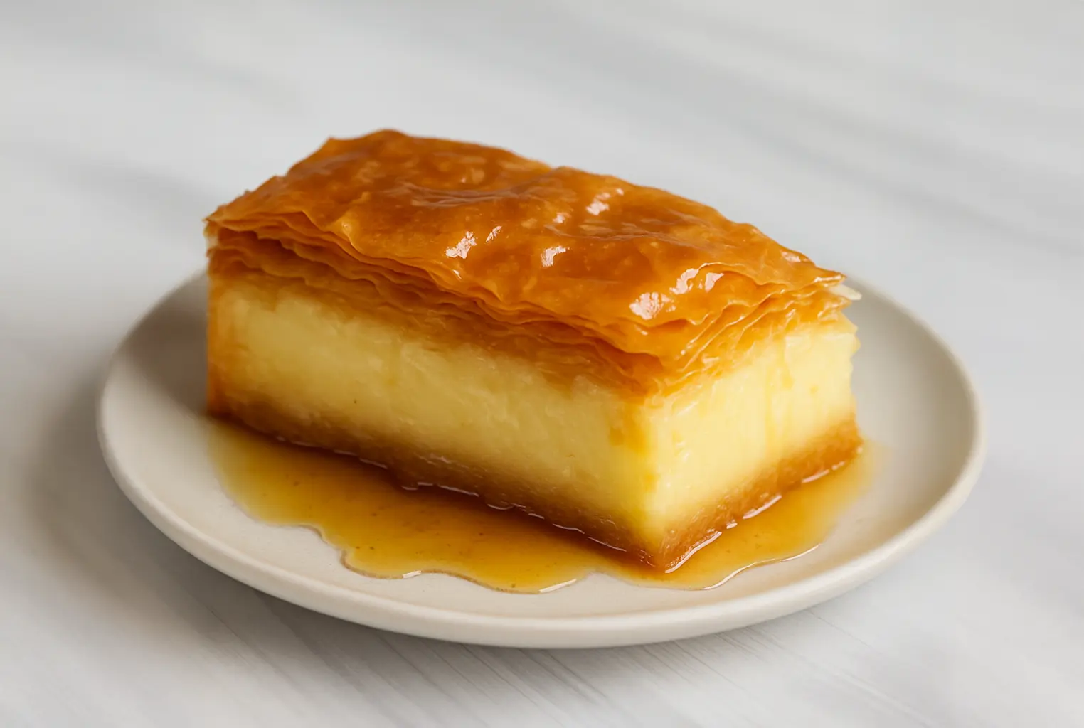Classic Greek custard pastry ripped in flaky phyllo, drizzled with syrup